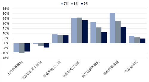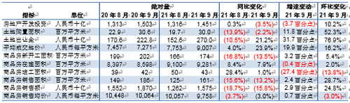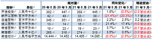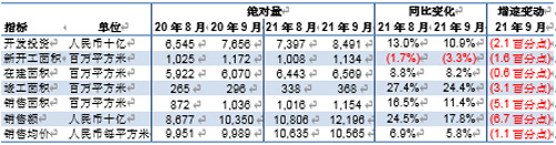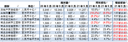9月,房地產(chǎn)投資額為人民幣1.45萬(wàn)億元,同比減少3.5%。同期土地銷售面積同比減少2.2%至2,997萬(wàn)平方米。土地出讓金同比增加21.2%至人民幣2,700億元,土地出讓均價(jià)同比上漲23.9%至每平方米人民幣9,007元。9月新開(kāi)工面積約1.74億平方米,同比減少13.5%。9月竣工面積同比增加1.0%至4,274萬(wàn)平方米。同期,商品房銷售面積約1.61億平方米,低于去年同期的1.86億平方米;銷售均價(jià)約為每平方米人民幣9,758元,同比下跌3.0%;銷售額達(dá)到人民幣1.57萬(wàn)億元,同比減少15.8%。