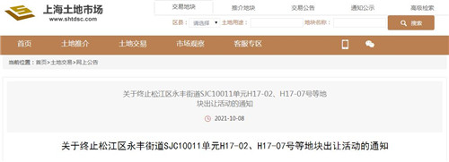 房訊網(wǎng)訊 10月8日,上海土地市場網(wǎng)發(fā)布《關(guān)于終止松江區(qū)永豐街道SJC10011單元H17-02、H17-07號等地塊出讓活動的通知》,對第二批集中供地中7幅地塊終止出讓。