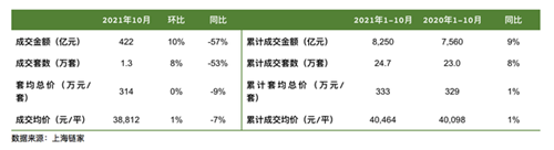 綜合看,2021年前10個月,上海全市二手房累計成交金額8250億元,同比增長9%;成交套數(shù)24.7萬套,同比增長8%;套均總價333萬元/套,同比增長1%;成交均價40464元/平方米,同比增長1%。