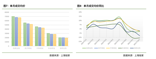 從均價同比來看,各環(huán)線均價同比均出現(xiàn)下跌,外環(huán)以外跌幅相對更大。從均價環(huán)比來看,各環(huán)線跌幅則相差不是很大。