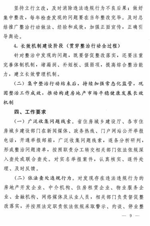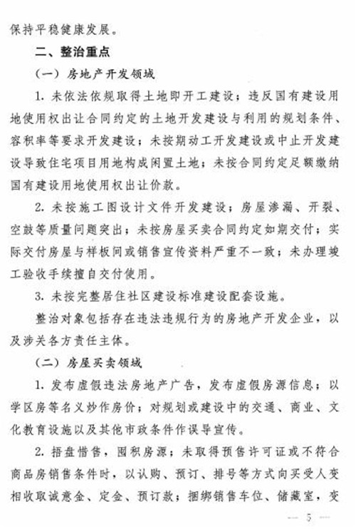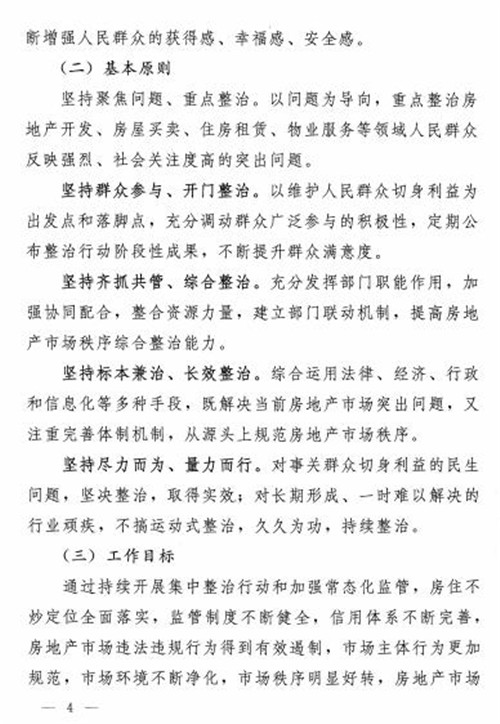 內(nèi)容指出,要按照“堅(jiān)持群眾參與、開門整治;堅(jiān)持齊抓共管、綜合整治;堅(jiān)持標(biāo)本兼治、長效整治;堅(jiān)持量力而為、量力而行”四項(xiàng)基本原則,對(duì)房地產(chǎn)開發(fā)領(lǐng)域、房屋買賣領(lǐng)域、住房租賃領(lǐng)域、物業(yè)服務(wù)領(lǐng)域進(jìn)行重點(diǎn)整治。