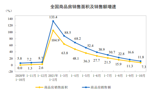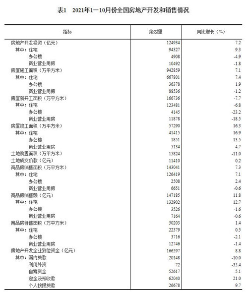 1—10月份,商品房銷售面積143041萬(wàn)平方米,同比增長(zhǎng)7.3%;比2019年1—10月份增長(zhǎng)7.3%,兩年平均增長(zhǎng)3.6%。其中,住宅銷售面積增長(zhǎng)7.1%,辦公樓銷售面積增長(zhǎng)2.4%,商業(yè)營(yíng)業(yè)用房銷售面積下降0.6%。商品房銷售額147185億元,增長(zhǎng)11.8%;比2019年1—10月份增長(zhǎng)18.3%,兩年平均增長(zhǎng)8.8%。其中,住宅銷售額增長(zhǎng)12.7%,辦公樓銷售額下降1.6%,商業(yè)營(yíng)業(yè)用房銷售額下降0.6%。