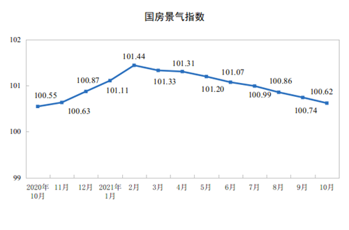 10月份,房地產(chǎn)開(kāi)發(fā)景氣指數(shù)(簡(jiǎn)稱“國(guó)房景氣指數(shù)”)為100.62。