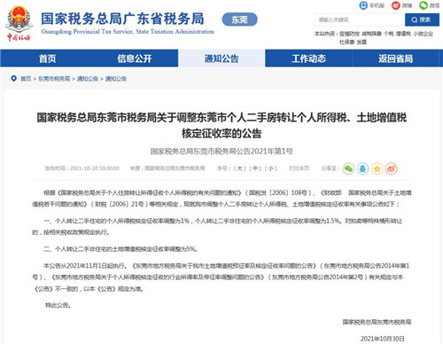 房訊網(wǎng)訊 10月30日,國(guó)家稅務(wù)總局東莞市稅務(wù)局發(fā)布《關(guān)于調(diào)整東莞市個(gè)人二手房轉(zhuǎn)讓個(gè)人所得稅、土地增值稅核定征收率的公告》,自2021年11月1日起執(zhí)行。