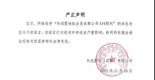 房訊網(wǎng)訊 11月18日,華潤(rùn)置地成都公司官方微信號(hào)發(fā)布聲明稱,近日網(wǎng)絡(luò)謠傳“華潤(rùn)置地?cái)M出售成都公司51%股權(quán)”的消息內(nèi)容為不實(shí)謠言,該謠言已對(duì)華潤(rùn)置地成都公司聲譽(yù)造成嚴(yán)重影響,華潤(rùn)置地成都公司將依據(jù)法律法規(guī)追究造謠者相關(guān)法律責(zé)任。