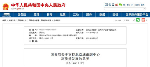 房訊網(wǎng)訊 11月26日,國(guó)務(wù)院發(fā)布關(guān)于支持北京城市副中心高質(zhì)量發(fā)展的意見(jiàn),提出到2025年,城市副中心綠色城市、森林城市、海綿城市、智慧城市、人文城市、宜居城市功能基本形成。到2035年,現(xiàn)代化城市副中心基本建成。