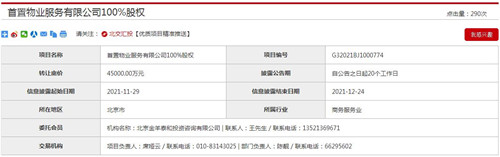 房訊網(wǎng)訊 11月29日,北京產(chǎn)權(quán)交易中心平臺披露首置物業(yè)服務(wù)有限公司100%股權(quán)轉(zhuǎn)讓信息,轉(zhuǎn)讓底價4.5億元。標(biāo)的公司由首創(chuàng)置業(yè)有限公司100%持股,成立日期為2012年5月8日,注冊資本1億元,法定代表人為林智勇,所屬行業(yè)為商務(wù)服務(wù)業(yè)。