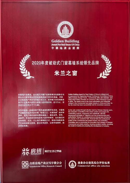 中國寫字樓產(chǎn)業(yè)園發(fā)展論壇第十七屆年會(huì)上,2020年(第17屆)中國地產(chǎn)金廈獎(jiǎng)揭曉。米蘭之窗再度蟬聯(lián)“2020年度被動(dòng)式門窗幕墻系統(tǒng)領(lǐng)先品牌獎(jiǎng)”。
