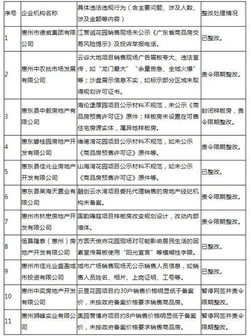 房訊網(wǎng)訊 11月4日,惠州市住房和城鄉(xiāng)建設(shè)局發(fā)布《關(guān)于2021年第四季度查處違法違規(guī)房地產(chǎn)開(kāi)發(fā)企業(yè)的情況通報(bào)》,11個(gè)房地產(chǎn)開(kāi)發(fā)企業(yè)及項(xiàng)目被通報(bào),責(zé)令限期整改。