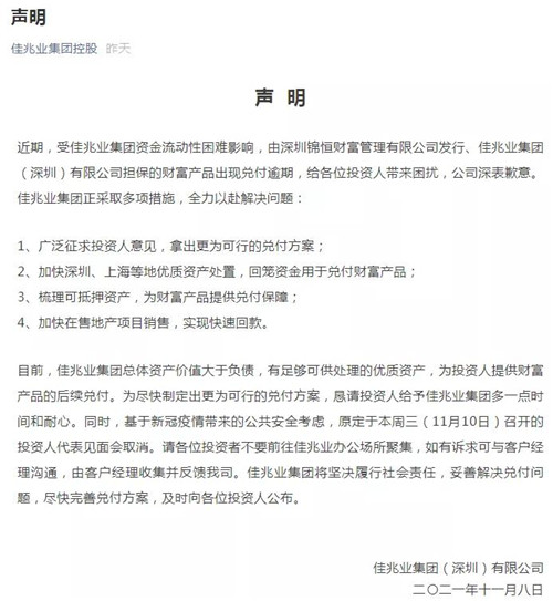 房訊網(wǎng)訊 11月8日,佳兆業(yè)集團(tuán)發(fā)布聲明,就近期由深圳錦恒財(cái)富管理有限公司發(fā)行、佳兆業(yè)集團(tuán)(深圳)有限公司擔(dān)保的財(cái)富產(chǎn)品出現(xiàn)兌付逾期,向投資人表達(dá)歉意。