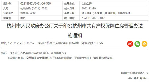 房訊網(wǎng)訊 12月1日,杭州市人民政府官網(wǎng)發(fā)布《關(guān)于印發(fā)杭州市共有產(chǎn)權(quán)保障住房管理辦法的通知》,健全多主體供給、多渠道保障、租購并舉的住房制度,完善保障性住房供應(yīng)體系,規(guī)范共有產(chǎn)權(quán)保障住房建設(shè)和管理,保障市民住房基本需求。