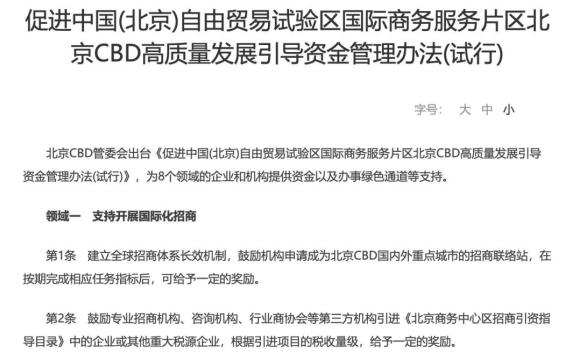 近日,北京CBD再次發(fā)布推動高質(zhì)量的18條,即《促進(jìn)中國(北京)自由貿(mào)易試驗區(qū)國際商務(wù)服務(wù)片區(qū)北京CBD高質(zhì)量發(fā)展引導(dǎo)資金管理辦法(試行)》,內(nèi)容涉及國際化招商、總部企業(yè)能級提升、國際開放前沿、樓宇提質(zhì)增效等18條政策。