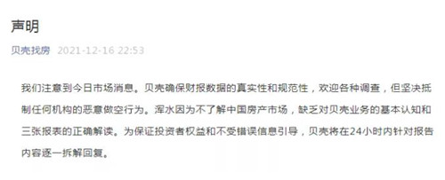 房訊網(wǎng)訊 12月16日,有消息稱渾水公司正在做空貝殼找房,稱其收入數(shù)據(jù)、GTV、存量房交易額等數(shù)據(jù)被夸大。對(duì)此貝殼找房發(fā)布聲明回應(yīng),表示注意到今日市場(chǎng)消息。