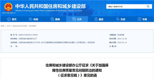 房訊網(wǎng)訊 12月30日,住建部發(fā)布《關(guān)于加強保障性住房質(zhì)量常見問題防治的通知(征求意見稿)》,要求各地要在執(zhí)行相關(guān)標準規(guī)范基礎(chǔ)上,結(jié)合實際和群眾反映的突出問題,制定本地保障性住房質(zhì)量常見問題防治要點,在滲漏、隔音、室內(nèi)空氣質(zhì)量、裂縫、固定家具安裝、管線設(shè)置、外墻脫落等方面,達到最基本的控制要求。