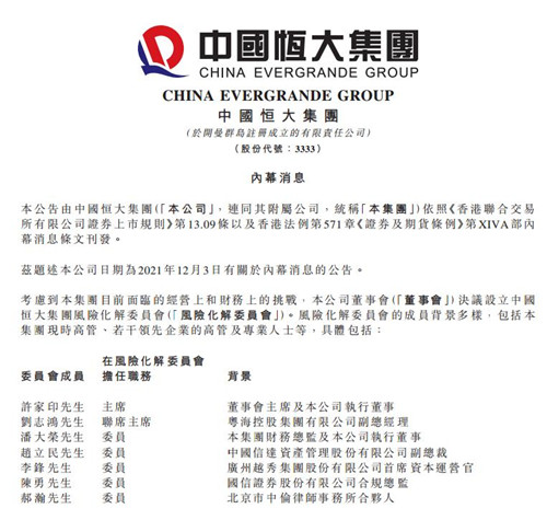房訊網(wǎng)訊 12月6日,中國(guó)恒大發(fā)布公告稱,考慮到集團(tuán)目前面臨的經(jīng)營(yíng)上和財(cái)務(wù)上的挑戰(zhàn),公司董事會(huì)決議設(shè)立中國(guó)恒大集團(tuán)風(fēng)險(xiǎn)化解委員會(huì)。