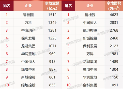 2020年房企拿地面積與金額TOP10 數(shù)據(jù)來(lái)源:中指研究院