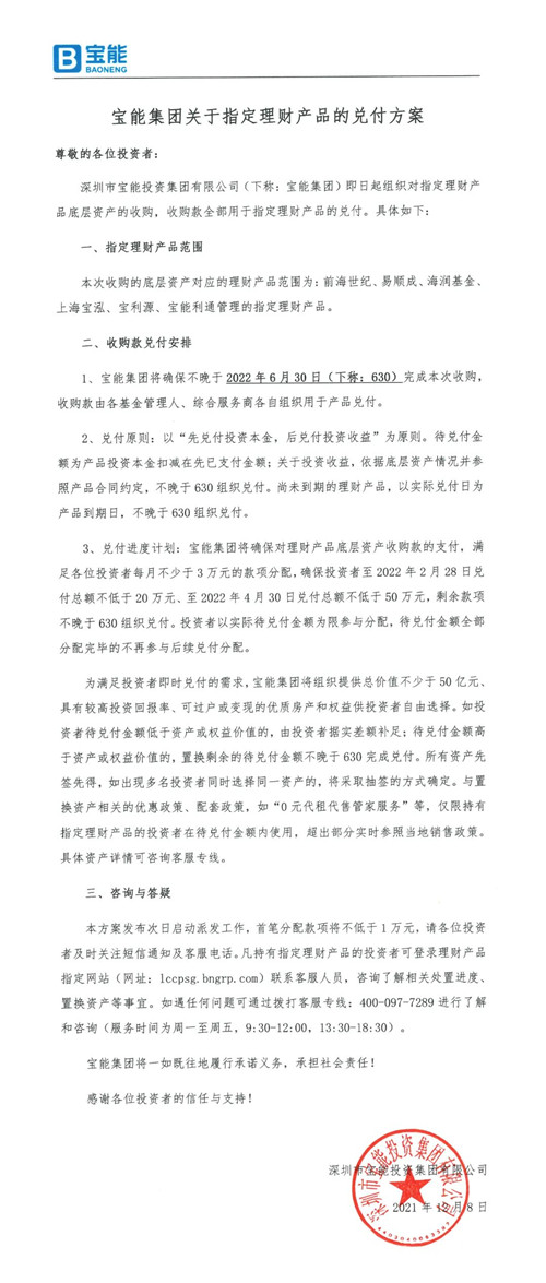 房訊網(wǎng)訊 12月8日晚,寶能集團官微發(fā)布理財產(chǎn)品的兌付方案,即日起組織對指定理財產(chǎn)品底層資產(chǎn)收購,收購款全部用于指定理財產(chǎn)品的兌付。