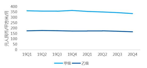 根據(jù)貝殼研究院監(jiān)測(cè),2020年末,代表性甲級(jí)寫(xiě)字樓每月平均凈有效租金為336元每平方米(不含物業(yè)費(fèi)),比3季度末下跌2.6%,比去年同期下跌7.9%。代表性乙級(jí)寫(xiě)字樓每月平均凈有效租金為167元每平方米(不含物業(yè)費(fèi)),比3季度末下降2.9%,比去年同期下降4.0%。甲級(jí)寫(xiě)字樓租金同比降幅超過(guò)乙級(jí)寫(xiě)字樓租金同比降幅近一倍。