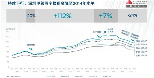 其中,深圳更以12.8%的租金年度降幅首當其沖,自2019年1季度開始,深圳全市租金已連續(xù)8個季度回落,自2018年末高點累計下降23.55%,當前全市租金與2014年2季度相當,為每月每平方米211.49元。