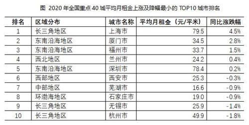 租金同比上漲及降幅最小的10個(gè)城市,同比降幅最大為1.8%,上海租金同比漲幅居榜首。從區(qū)域分布來看,長三角和東南沿海地區(qū)分布城市最多,長三角地區(qū)包括上海、無錫和杭州市,東南沿海地區(qū)為廈門、福州和深圳市,其余城市分別分布在西北、西部、中部和環(huán)渤海地區(qū)。