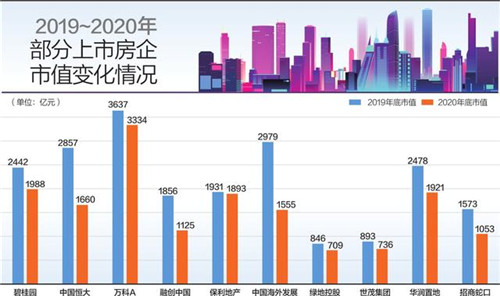 據(jù)《每日經(jīng)濟新聞》記者不完全統(tǒng)計,截至2020年12月31日,50家上市房企中有46家房企市值下降,僅有4家房企市值上升,總體市值由2019年的36881.3億元,下跌22%至28767.1億元,在一年時間里共縮水超過8000億元。