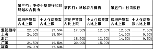 其中,第一檔為中資大型銀行,房地產(chǎn)貸款和個人住房貸款占比上限分別為40%、32.5%;第二檔為中資中型銀行,兩項占比上限分別為27.5%、20%;第三檔中資小型銀行和非縣域農(nóng)合機構(gòu),兩項占比上限分別為22.5%、17.5%;第四檔縣域農(nóng)合機構(gòu),兩項占比上限分別為17.5%、12.5%;第五檔村鎮(zhèn)銀行,上限分別為12.5%、7.5%。