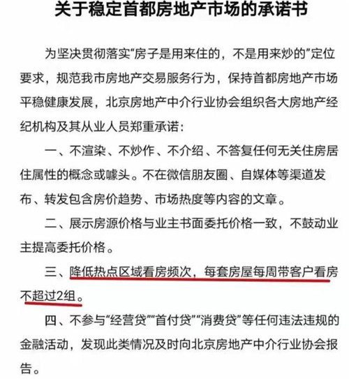 承諾書提及,北京房地產(chǎn)中介行業(yè)協(xié)會(huì)組織各大房地產(chǎn)經(jīng)紀(jì)機(jī)構(gòu)及其從業(yè)人員承諾“不渲染、不炒作、不介紹、不答復(fù)任何無關(guān)住房居住屬性的概念或噱頭”“每套房屋每周帶客戶看房不超過2組”等。