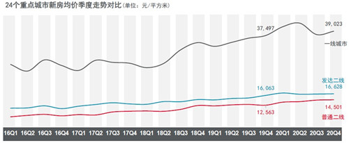 2020年,一線、發(fā)達(dá)二線及普通二線城市的新房成交均價同比漲幅分別為10.3%,8.7%及12.2%,較2019漲幅分別年下降5.9個百分點(diǎn),2.1個百分點(diǎn)及0.6個百分點(diǎn)。結(jié)合2020年全國新房住宅均價同比上漲7.5%來看,24個重點(diǎn)城市價格漲幅均超過全國平均水平,普通二線城市價格同比漲幅更為明顯。