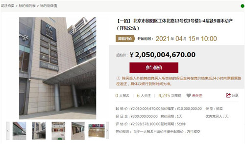 房訊網(wǎng)訊 據(jù)北京產(chǎn)權(quán)交易所披露,北京世茂工三將于4月15日在北交互聯(lián)網(wǎng)絡(luò)司法拍賣平臺(tái)上進(jìn)行公開(kāi)拍賣,評(píng)估價(jià)為29.29億元,起拍價(jià)為20.5億元。本次拍賣為第一次拍賣,時(shí)間為4月15日10時(shí)至4月16日10時(shí)止。