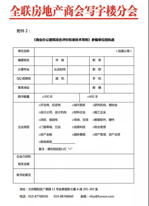 有參編意向的單位,請將加蓋單位公章的《商業(yè)辦公建筑綜合評價標(biāo)準(zhǔn)技術(shù)導(dǎo)則》參編單位回執(zhí)函(附件 2),以電子郵件或郵寄方式,反饋至寫字樓分會。