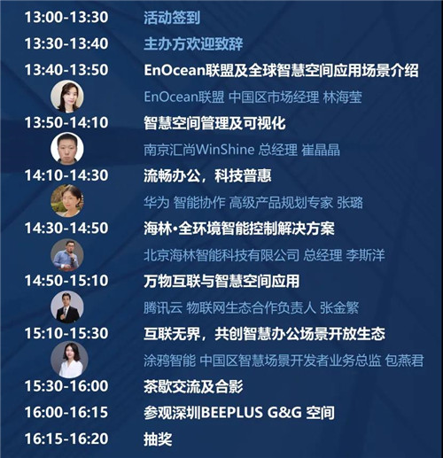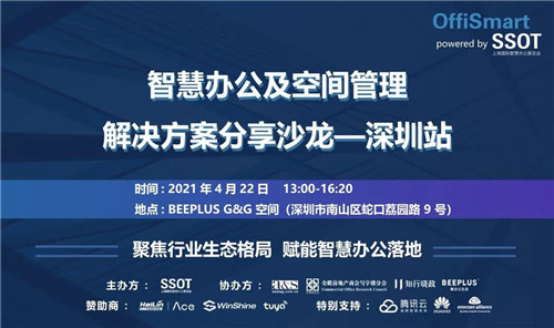 本次OffiSmart智慧辦公及空間管理解決方案分享沙龍-4.22深圳站特邀騰訊云、華為、EnOcean聯(lián)盟、海林智能、Winshine、涂鴉智能等企業(yè)探討智慧辦公及商業(yè)空間管理的未來趨勢,分享創(chuàng)新技術(shù)與落地案例,呈現(xiàn)解決用戶實際需求的智慧辦公整體解決方案,助力業(yè)者應(yīng)對快速更迭的商業(yè)環(huán)境,領(lǐng)跑智慧辦公行業(yè)市場復(fù)蘇。