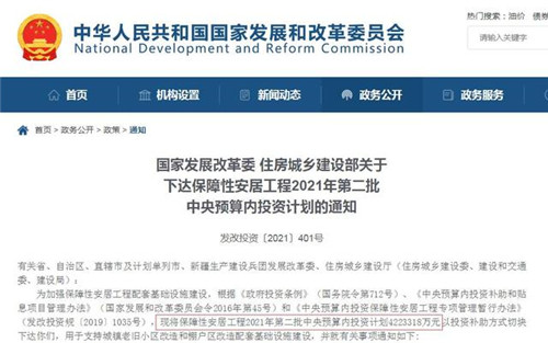 據(jù)國家發(fā)改委消息,2日,國家發(fā)改委、住建部印發(fā)關(guān)于下達(dá)保障性安居工程2021年第二批中央預(yù)算內(nèi)投資計劃的通知,通知稱,將保障性安居工程2021年第二批中央預(yù)算內(nèi)投資計劃4223318萬元,用于支持城鎮(zhèn)老舊小區(qū)改造和棚戶區(qū)改造配套基礎(chǔ)設(shè)施建設(shè)。