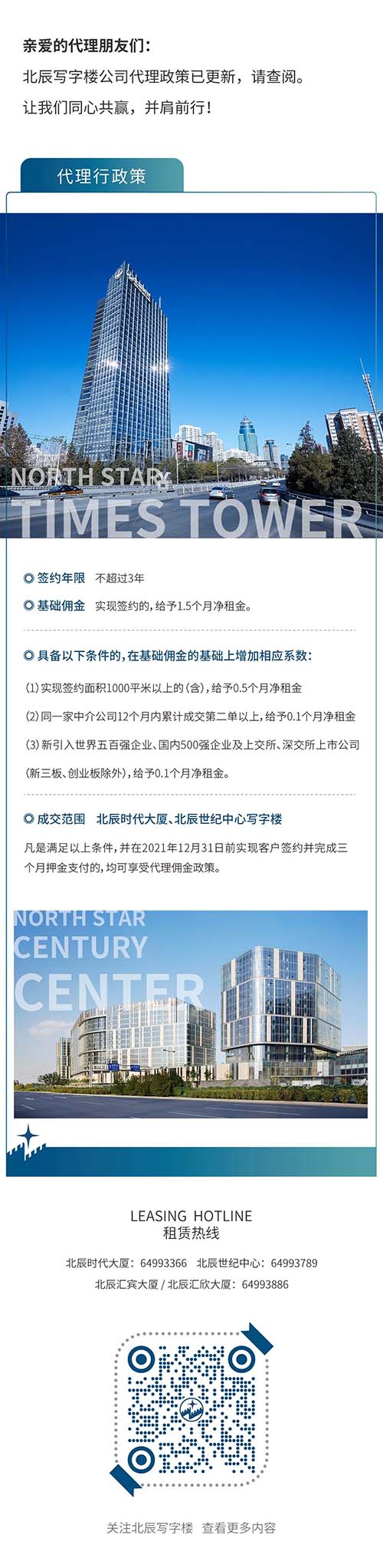 房訊網(wǎng)訊 據(jù)北辰寫字樓官微消息,4月6日,北辰寫字樓公司代理政策更新發(fā)布:對簽約年限不超過3年的,將給予代理公司1.5個月凈租金的基礎傭金;此外,符合某些具體條件的,還將會在基礎傭金的基礎上增加相應系數(shù)。