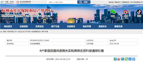 房訊網(wǎng)訊 4月8日,杭州市住房保障和房產(chǎn)管理局發(fā)布通報(bào),對(duì)在商品住房公證搖號(hào)登記過(guò)程中提供虛假購(gòu)房報(bào)名資料的4戶家庭作出了“一年內(nèi)不再受理限購(gòu)查檔申請(qǐng)”的通報(bào)處理。