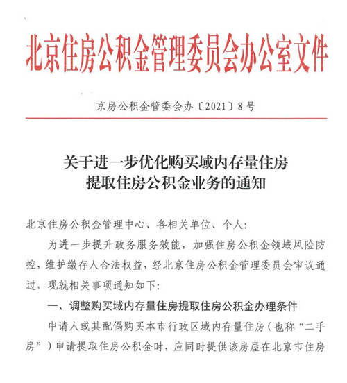 房訊網(wǎng)訊 5月8日,北京住房公積金管理中心發(fā)布關(guān)于《進一步優(yōu)化購買域內(nèi)存量住房提取住房公積金業(yè)務(wù)的通知》,通知提出,申請人或其配偶購買本市行政區(qū)域內(nèi)存量住房申請?zhí)崛∽》抗e金時,應(yīng)同時提供該房屋在北京市住房和城鄉(xiāng)建設(shè)委員會簽約備案的購房合同編號,及過戶后的房屋所有權(quán)證號或不動產(chǎn)權(quán)證號,聯(lián)網(wǎng)核驗無誤后即可辦理。