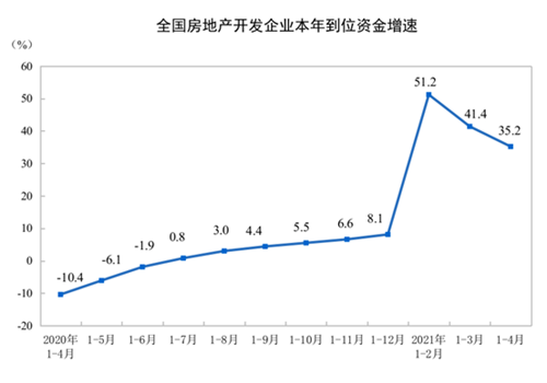 1—4月份,房地產(chǎn)開發(fā)企業(yè)到位資金63542億元,同比增長(zhǎng)35.2%;比2019年1—4月份增長(zhǎng)21.1%,兩年平均增長(zhǎng)10.1%。其中,國(guó)內(nèi)貸款9043億元,增長(zhǎng)3.6%;利用外資17億元,下降28.3%;自籌資金17167億元,增長(zhǎng)15.4%;定金及預(yù)收款24362億元,增長(zhǎng)74.1%;個(gè)人按揭貸款10738億元,增長(zhǎng)41.3%。