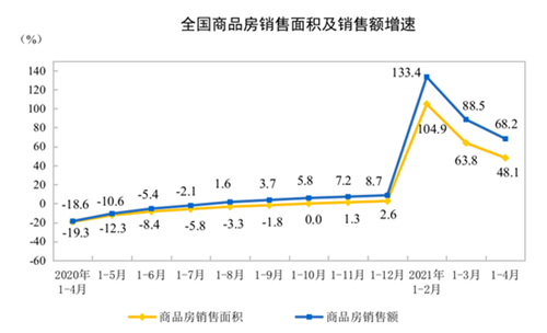 1—4月份,商品房銷售面積50305萬平方米,同比增長(zhǎng)48.1%;比2019年1—4月份增長(zhǎng)19.5%,兩年平均增長(zhǎng)9.3%。其中,住宅銷售面積增長(zhǎng)51.1%,辦公樓銷售面積增長(zhǎng)20.0%,商業(yè)營(yíng)業(yè)用房銷售面積增長(zhǎng)16.3%。商品房銷售額53609億元,增長(zhǎng)68.2%;比2019年1—4月份增長(zhǎng)37.0%,兩年平均增長(zhǎng)17.0%。其中,住宅銷售額增長(zhǎng)73.2%,辦公樓銷售額增長(zhǎng)31.9%,商業(yè)營(yíng)業(yè)用房銷售額增長(zhǎng)20.3%。