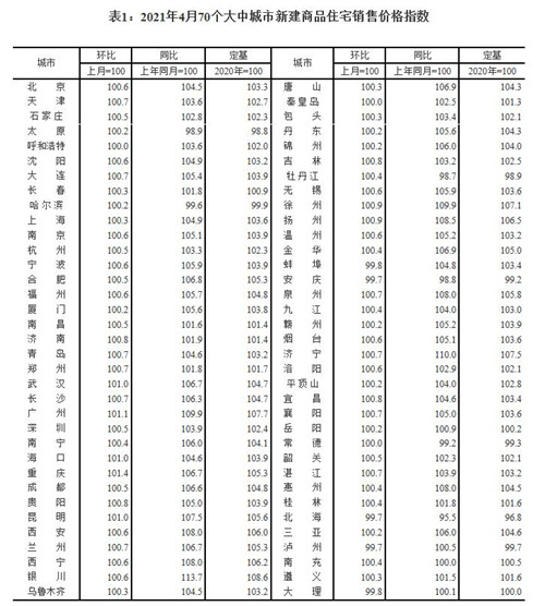 房訊網(wǎng)訊 5月17日,國家統(tǒng)計(jì)局發(fā)布4月份70個(gè)大中城市商品住宅銷售價(jià)格變動(dòng)情況顯示,2021年4月份,統(tǒng)計(jì)監(jiān)測(cè)的70個(gè)大中城市新建商品住宅銷售價(jià)格漲幅總體有所擴(kuò)大,二手住宅漲幅有升有落。