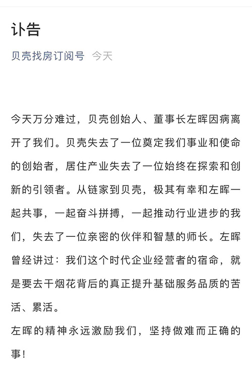 房訊網(wǎng)訊 貝殼發(fā)布公告,公司創(chuàng)始人兼董事長(zhǎng)左暉先生因疾病意外惡化于2021年5月20日去世。