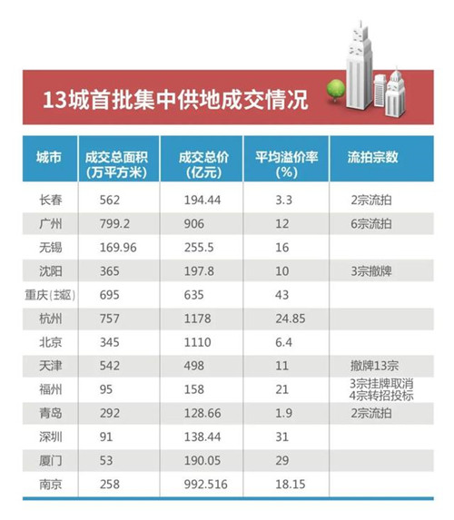 首批集中供地的13個城市覆蓋東北、華北、華東、華南和西南五大區(qū)域,東北地區(qū)為沈陽、長春,華北地區(qū)為北京、天津、青島,華東地區(qū)為杭州、無錫和南京,華南地區(qū)為廣州、深圳、福州、廈門,西南區(qū)域為重慶。