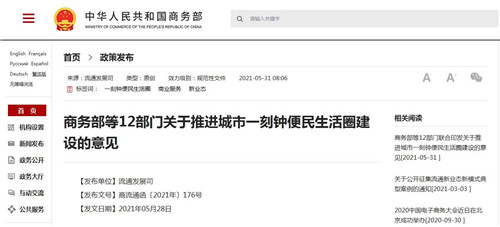 商務(wù)部等12部門(mén)關(guān)于推進(jìn)城市一刻鐘便民生活圈建設(shè)的意見(jiàn)