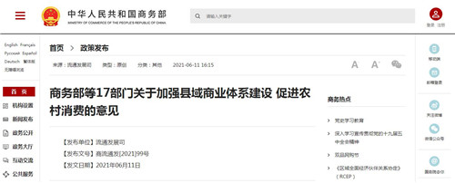 商務(wù)部等17部門關(guān)于加強(qiáng)縣域商業(yè)體系建設(shè) 促進(jìn)農(nóng)村消費(fèi)的意見