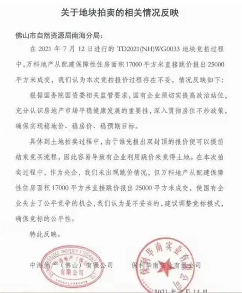 “作為央企,我們未出現(xiàn)跳價(jià)情況,但萬科地產(chǎn)從配建保障性住房面積17000平方米直接跳價(jià)報(bào)出25000平方米成交,使國有企業(yè)失去了公平競爭的機(jī)會(huì),我們認(rèn)為是不妥當(dāng)?shù),建議調(diào)整競標(biāo)模式”。佛山市自然資源局南海分局相關(guān)負(fù)責(zé)人向記者證實(shí)了信函的真實(shí)性,并表示,“交易規(guī)則是公開透明的,中海、保利的訴求不合理,我們不予支持”。(經(jīng)濟(jì)觀察網(wǎng))