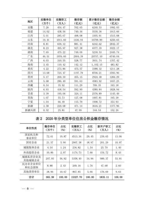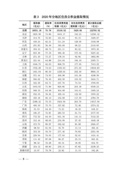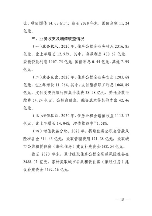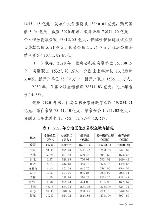 2020年,住房公積金繳存額26210.83億元,提取額18551.18億元,發(fā)放個(gè)人住房貸款13360.04億元,購買國債5.04億元。截至2020年末,繳存余額73041.40億元,個(gè)人住房貸款余額62313.53億元,保障性住房建設(shè)試點(diǎn)項(xiàng)目貸款余額5.61億元,國債余額11.24億元,住房公積金結(jié)余資金10711.02億元。