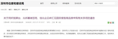房訊網(wǎng)訊 7月29日,深圳市住房和建設(shè)局發(fā)布通告,經(jīng)光明區(qū)住房和建設(shè)局審定,并經(jīng)深圳市住房和建設(shè)局批準(zhǔn),決定啟動民軒攬翠臺、兆邦基端慧苑、佳兆業(yè)云峰匯花園安居型商品房配售工作。本次安居型商品房的配售對象包括深圳市安居型商品房在冊輪候人以及符合條件的領(lǐng)軍人才。
