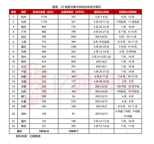 6月接近尾聲,試點(diǎn)集中供地的22城的首批集中供地已經(jīng)結(jié)束,部分城市的第二次供地也已經(jīng)結(jié)束。22城首次集中供地總成交金額超萬(wàn)億,土地成交總建筑面積為1.08億平米,杭州以1178億元總成交金額居于首位,北京、南京、廣州、武漢、上海、重慶土地成交總金額均超500億元。