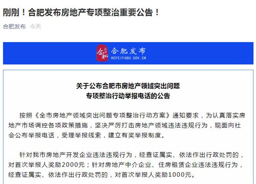 關(guān)于公布合肥市房地產(chǎn)領(lǐng)域突出問(wèn)題專(zhuān)項(xiàng)整治行動(dòng)舉報(bào)電話的公告