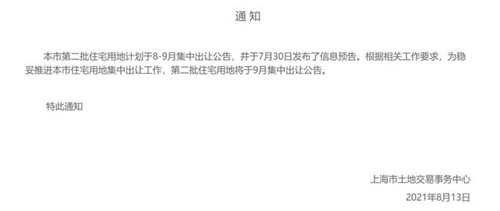 房訊網(wǎng)訊 8月13日晚,上海市土地交易事務(wù)中心發(fā)布公告稱,上海市第二批住宅用地計劃于8-9月集中出讓公告,并于7月30日發(fā)布了信息預(yù)告。根據(jù)相關(guān)工作要求,為穩(wěn)妥推進本市住宅用地集中出讓工作,第二批住宅用地將于9月集中出讓公告。