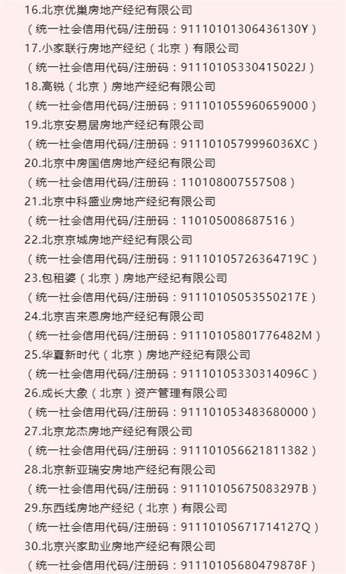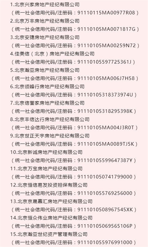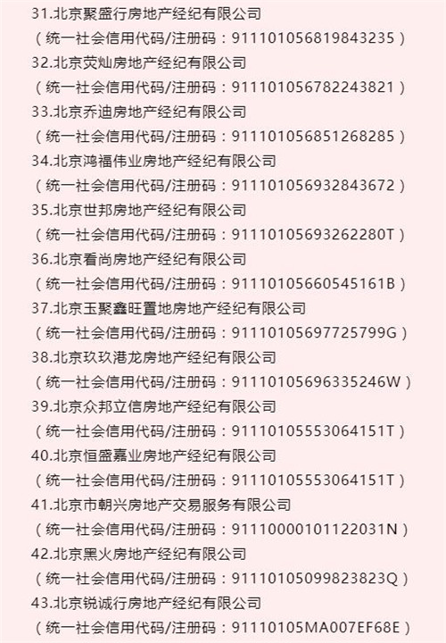 公告顯示,朝陽區(qū)北京興家房地產經紀有限公司、北京萬豐房地產經紀有限公司等43家房地產經紀機構未在備案地址經營,且因“通過登記的住所或者經營場所無法聯(lián)系”被列入北京市市場監(jiān)督管理局經營異常名錄。