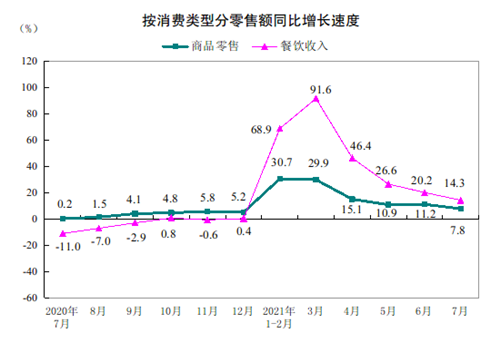 按消費(fèi)類型分,7月份,商品零售31174億元,同比增長(zhǎng)7.8%;餐飲收入3751億元,增長(zhǎng)14.3%。1—7月份,商品零售221366億元,同比增長(zhǎng)18.7%;餐飲收入25463億元,增長(zhǎng)42.3%。